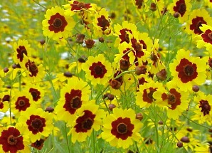 | Coreopsis, Plains Coreopsis tinctoria A bright yellow flower with maroon centers. This annual is native to the Central Great Plains and southern Midwest. This flower reaches a height of 1'-3'. It has a long blooming period May thru Sept. which gives lasting color. Does well in moist to dry sunny areas. A great wildflower for color the first year in a wildflower or meadow planting. |