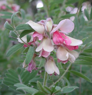 | Goatsrue Tephrosia virginiana This native plant forms dense clusters of pale yellow and pink petals atop its stem that only branches at the ground. Because of the stringy root system this plant has, it also goes by the name "Devils Shoestring". Companion plants can be June Grass (Koeleria cristata), Leadplant (Amorpha canescens) and Purple Prairie Clover (Petalostemum purpureum) and Western Sunflower (Helianthus occidentalis). This Legume blooms May thru June and has downy gray foliage. It grows to a height of 12"-24". |