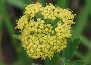 | Golden Alexanders, Heart-leaf Zizia aptera Common throughout the tallgrass regions, this plant grows 1'-3' in wet meadows, wet to dry prairies and moist thickets. The branched plants are smooth with stalked, alternate compound leaves which are evenly toothed. Blooms mid-spring to early summer and is a member of of the Parsley family. |