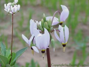 Shooting Star Dodecatheon meadia A perennial in the primrose family and is fairly easy to identify. The plant normally has one or more stiff green stems rising from a rosette of basal leaves with reddish midribs. Clusters of 4 - 100 flowers dangle from the top of the leafless stem. Each flower has 5 white pink-lavendar petals that typically bend back. The Shooting Star will grow well in light shade to full sun. It's found in open woods and prairies under natural conditions. It can easily be propagated by seed or root divisions. Normal flowering time is mid to late springtime and it grows well in zones 4-8. |