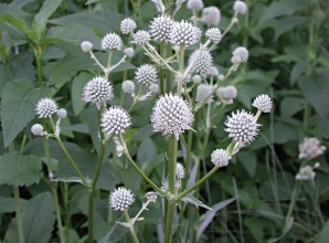 Rattlesnake Master Eryngium yuccifolium This interesting plant with its unusual white flowered balls and yucca like foliage reaches a height of 3'-4'. Blooms summer into fall and does best in well drained soil. An outstanding display if grown with Cardinal Flower (Lobelia cardinalis). |
