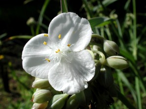 Spiderwort White Tradescantia ohiensis-alba Brilliant flowers atop this plant that is the same as the Blue Spiderwort, but white in color. This plant will form clumps late spring thru summer. It is native to the Midwest and reaches a height of 1'-2'. It grows well on loamy and sandy soil in full sun to partial shade. A wildflower that is very easy to start from seed. Companion plants could be Little Bluestem (Andropogon scoparius), Prairie Phlox (Phlox pilosa), and Round-headed Bush Clover (Lespedeza capitata). |